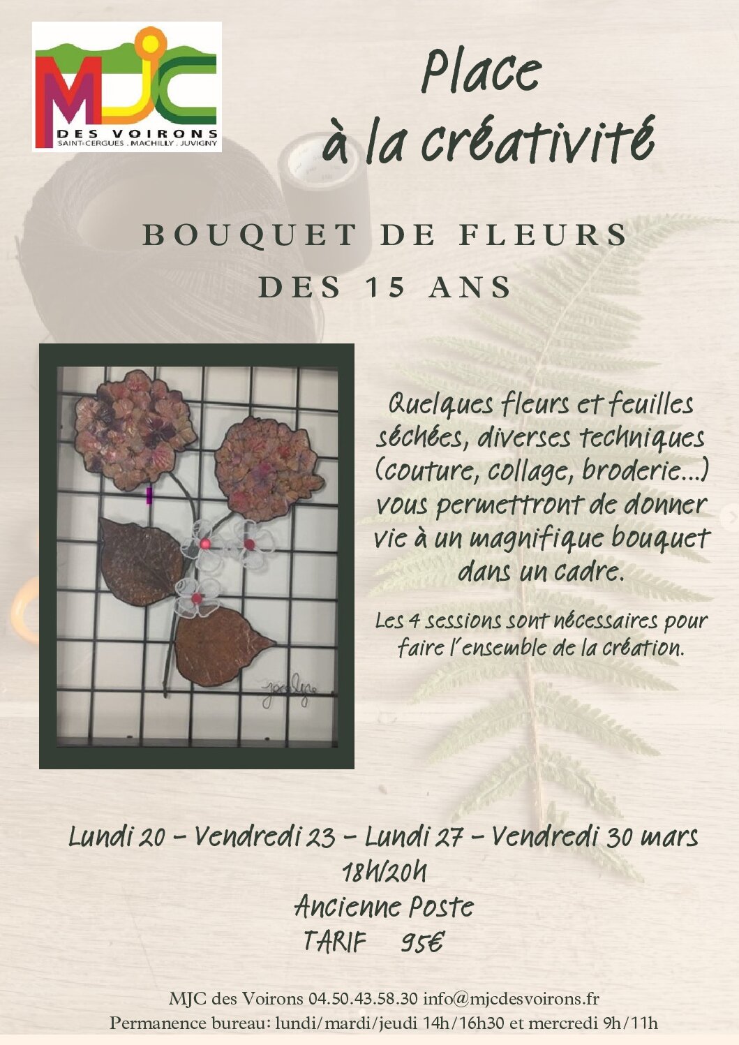 Quelques fleurs et feuilles séchées, diverses techniques vous permettront de donner vie à un magnifique bouquet dans un cadre. Lundi 20 - Vendredi 23 - Lundi 27 - Vendredi 30 […]